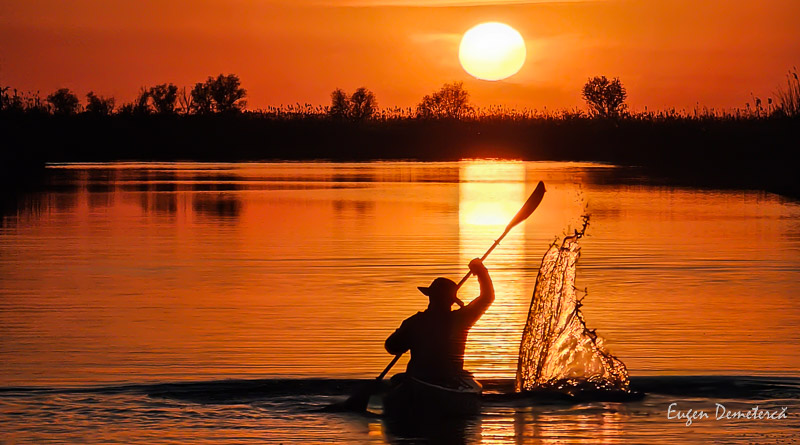 Aceste momente ale zilei sunt spectaculoase în sine, cu dulceața suavă sau puternică a auriurilor și a portocaliului. Dar întotdeauna știu că pot face ceva ca să cresc nivelul. Și-am început să întreb în stânga și-n dreapta cine iese cu caiacul pe apă. Radu nu, Șerban nu, Egi nu… Până la urmă lui Daniel i s-a făcut milă de potențialul irosit al acestui apus și s-a sacrificat pentru ședința foto.
